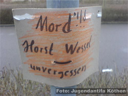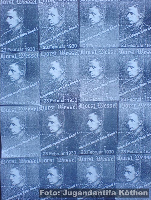 23. Februar 2009 / Köthen (Landkreis Anhalt-Bitterfeld) In der Köthener Innenstadt stellen couragierte Bürger mehrere Dutzend rechtsextreme Plakate mit der Aufschrift „Horst Wessel - Ermordet durch rote Hand! – 23. Februar 1930“ fest und entfernen diese teilweise. Zudem werden mehrere neonazistische Graffitis mit Schriftzügen wie „Rudolf Hess – Du warst ein Held!“ gemeldet. ![]() Der bekennende Nationalsozialist Wessel war Mitglied der paramilitärischen Terrororganisation SA, in der die Straßenschläger der NSDAP organisiert waren. Infolge schwerer Verletzungen verstarb der Nazi am 23. Februar 1930 in einem Krankenhaus. Die genauen Hintergründe seines Todes sind bis heute ungeklärt. Nach Auffassung der Justiz wurde Wessel am 14. Januar 1930 von Albrecht Höhler, einem aktiven Mitglied der KPD, und weiteren Kommunisten in seiner Wohnung aufgesucht, wobei Albrecht Höhler Horst Wessel beim Öffnen der Tür ins Gesicht geschossen haben soll. Deshalb gilt Wessel noch heute in der rechten Szene als Märtyrer. ![]() Bereits im vergangenen Jahr (mehr dazu hier...) machten Neonazis mit einer ähnlich gelagerten Propagandaaktion in Köthen auf sich aufmerksam. Quellen: Jugendantifa Köthen eigener Bericht |