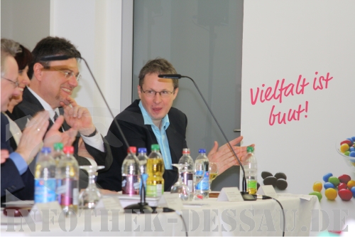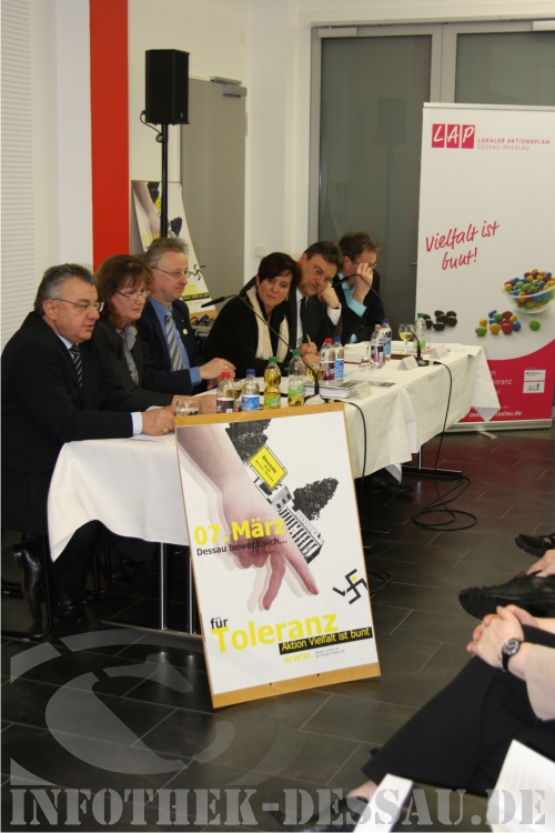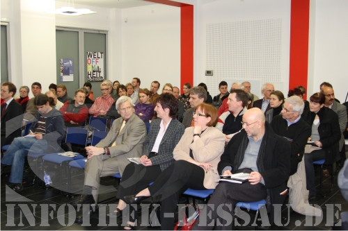Auf Einladung der Stadt, des Lokalen Aktionsplanes für Demokratie und Toleranz (mehr dazu hier...) und eines Initiativkreises, der gerade den demokratischen Protest gegen einen Naziaufmarsch vorbereitet (mehr dazu hier...), diskutierte Oberbürgermeister Klemens Koschig u.a. zusammen mit dem Bauhausdirektor Prof. Philipp Oswalt und dem Kirchenpräsidenten Joachim Liebig (mehr dazu hier...), wie ein zeitgemäßer und wirkungsvoller Umgang mit rechten Ereignislagen aussehen kann und welche Protestformen dabei wohl am erfolgversprechendsten wären. Um es gleich vorwegzunehmen, kontroverse Diskussionssträngeund strategische Debatten waren an diesem Abend eher die Ausnahme. Vielmehr wurde das gemeinsame Handeln aller demokratischen Kräfte eingefordert und dabei aber auch Positionen geäußert, die für den öffentlichen Diskurs in Dessau-Roßlau eine erfreuliche, neue Qualität darstellten.