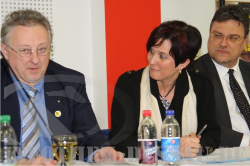 Oberbürgermeister Klemens Koschig (l.) wird intensiv von der Moderatorin Grit Lichtblau (m.) befragt
