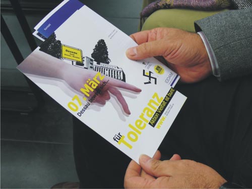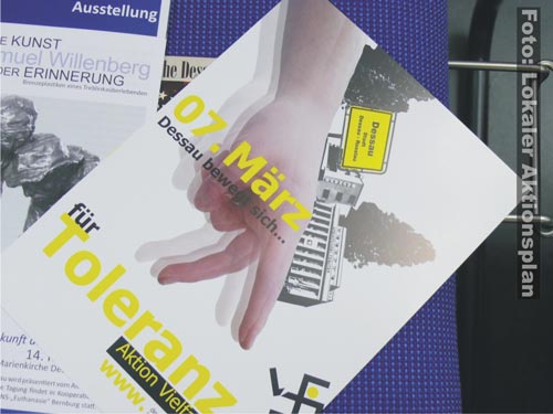 „Es gab auch in der DDR einen fruchtbaren Schoß."Der Dessauer Stadtrat Stefan Giese-Rehm sieht eine Intervention der Demokraten am 07. März 2009 als notwendig an, ruft dazu auf die Stadt an diesem Tag bunt zu gestalten und schränkt dennoch ein: „Das ist im wesentlichen eine Art Reparaturbetrieb.“ Vor allem müssten soziale Standards gewahrt werden. Als Beispiel nennt er ein warmes Mittagessen für jedes schulpflichtige Kind. Viele Familien, so Giese-Rehm, könnten sich nicht einmal das leisten. Und genau aus diesem Gefühl des Allein-Gelassen-Werdens, würden sich rassistische und rechtsextreme Stereotype speisen.