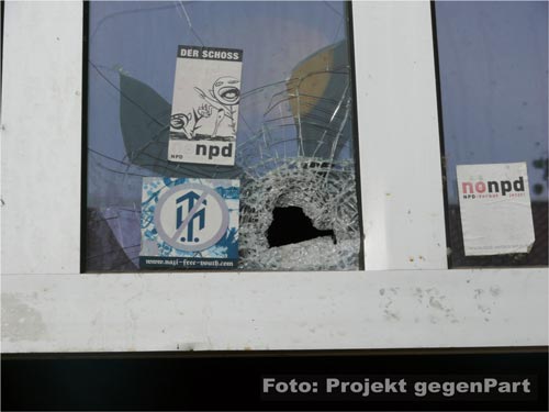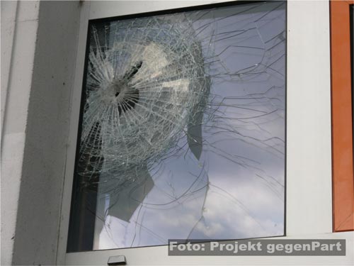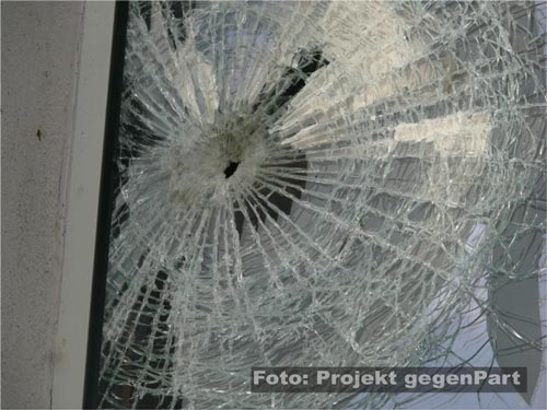 26. Juli 2008 / Dessau-Roßlau In den Morgenstunden des 26. Juli (02.00 Uhr) griffen mutmaßliche Rechtsextremisten das Alternative Jugendzentrum in Dessau mit Pflastersteinen an. Dabei wurden mehrere Sicherheitsglasscheiben zerstört. Der vorläufige Sachschaden wird auf mehrere tausend Euro geschätzt. Nur glücklichen Umständen ist es zu verdanken, dass dabei niemand verletzt wurde. Augenzeugen berichteten, dass sie mindestens 5 bislang unbekannte Angreifer beobachteten, die jedoch unerkannt flüchten konnten. ![]() der Verein übergab die mutmaßlichen Tatwerkzeuge der Polizei als Beweismittel ![]() das Alternative Jugendzentrum in Dessau-Roßlau Der Verein, im dem u.a. das Mobile Beratungsteam gegen Rechtsextremismus (Projekt gegenPart) und die Koordinierungsstelle des Lokalen Aktionsplanes für Demokratie und Toleranz ansässig sind (mehr dazu hier...), stellte Strafanzeige und informierte umgehend die Polizei. Der polizeiliche Staatsschutz ermittelt wegen Sachbeschädigung und Landfriedensbruch. ![]() zerstörte Scheibe im Eingangsbereich des Jugendzentrums Der neuerliche Angriff reiht sich dabei in eine ganze Kette von Attacken gegen das Jugendzentrum ein. In der vergangenen Woche bewarfen mutmaßliche Neonazis das Vereinsdomizil mit Bierflaschen und beschädigten die Eingangstür erheblich (mehr dazu hier...) und (hier...). ![]() ![]() im Vereinscafe gingen etliche Scheiben zu Bruch Erst gestern hatten Beratungsprojekte gegen Rechts aus Dessau-Roßlau in ihrer Bilanz der Halbjahresstatistik 2008 festgestellt, dass die Muldestadt zu einem Schwerpunkt rechter Gewalt geworden sei und organisierte Neonazis zusehends aggressiver und selbstbewusster agieren (mehr dazu hier...). Infos/Kontakt: ![]()