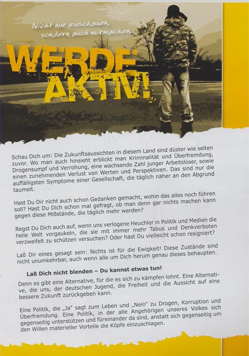 09. September 2008 / Dessau-Roßlau Im privaten Briefkasten des DGB-Landesvorsitzenden Udo Gebhardt, werfen mutmaßliche Neonazis offenbar gezielt rechtsextreme Propaganda ein. Während auf einem Flyer, der offensichtlich inhaltlich und graphisch für eine jugendliche Zielgruppe entworfen ist, dafür geworben wird, sich der rechtsextremen NPD-Jugend (JN - Junge Nationaldemokraten) anzuschließen, weist die andere Flugschrift auf eine Demonstration der rechtsextremen NPD hin (mehr dazu hier...). ![]() Flyer aus der rechten Szene, der für einen Neonaziaufmarsch am 20. September 2008 wirbt ![]() Propaganda-Flugblatt der neonazistischen JN Udo Gebhardt hat sich in der Vergangenheit immer wieder für Projekte und Initiativen gegen Rechts engagiert und gilt als aktive Mitstreiter des hiesigen Bündnisses gegen Rechtsextremismus (mehr dazu hier) und (hier...). ![]() Udo Gebhardt spricht auf einer Protestkundgebung gegen einen Neonaziaufmarsch am 08. März 2007 Quelle: eigener Bericht |