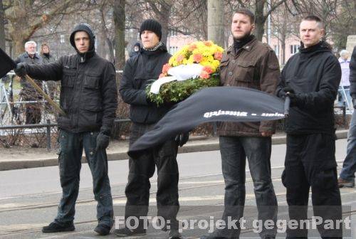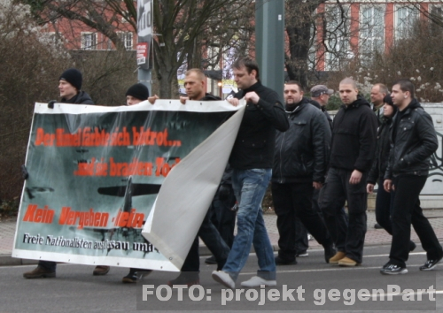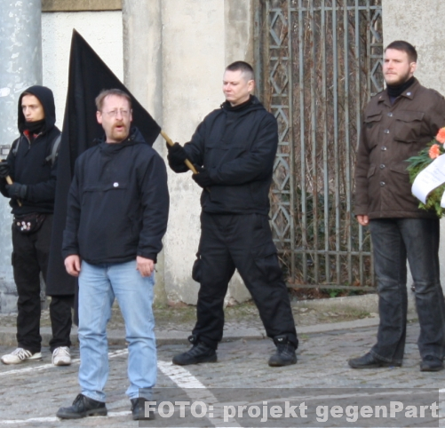 10. März 2012 / Dessau-Roßlau Am 10. März versammelten sich auch im Jahr 2012 Anhänger der sogenannten freien Kameradschaften und NPD-Aktivisten aus der Region in Dessau-Roßlau. Wie in den vergangenen Jahren (mehr dazu hier... und hier...) hatten die Neonazis zu einem Trauermarsch aufgerufen, um in der üblichen Manier die deutsche Kriegsschuld zu leugnen, vermeintlichen deutschen Helden zu gedenken und den Alliierten Kriegsverbrechen im Zweiten Weltkrieg vorzuwerfen. Allerdings scheinen auch die Neonazi-Kameraden kein sonderlich großes Interesse an dieser jährlichen Trauerfarce mehr zu haben, so fanden sich nochmals weniger Aktivisten als in den vergangenen Jahren ein. Die Rechtsextremisten Steffen M. und Christian W. beim Auftakt der Neonazi-Demonstration (2. Reihe). Gegen 13.30 Uhr setze sich der Demonstrationszug der Neonazis mit etwa 120 Teilnehmern vom Bahnhof aus in Bewegung. Nur eine Viertelstunde später hieß es zum ersten Mal stopp und warten für den Aufmarsch. In der Johannisstraße blockierten zahlreiche Gegendemonstranten friedlich die Straße. Nach einiger Wartezeit änderte die Polizei die Aufmarschroute, und die Neonazis wurden über die Hausmannstraße umgeleitet. Nachdem sich der Aufzug einige Meter am Stadtpark entlang bewegt hatte war auf der Kavalierstraße zunächst erneut Schluss. Gegendemonstranten blockierten in mehreren friedlichen Sitzblockaden die Route (mehr zu den Protesten und zur zentralen Kundgebung des Netzwerkes GELEBTE DEMOKRATIE finden sie hier...). ![]() Kranz- und Fahnenhalter beim Warten in der Kavalierstraße - der einschlägig vorbestrafte Rechtsextremist Per. M. rechts am Kranz. Nach einiger Wartezeit entschied sich die Einsatzleitung der Polizei zu einem undurchdachten und gefährlichen Manöver. In einer Hau-Ruck-Aktion sollten die Neonazis über den Bürgersteig der Kavalierstraße an den Blockaden vorbei geleitet werden. Dabei mussten die Kameraden nicht nur ihren Lautsprecherwagen zurücklassen, da das Fahrzeug nicht hindurch passte, durch eine weitere Blockade auf dem Bürgersteig wurde zudem der Aufzug in zwei Teile geteilt. Ohne entsprechende Polizeibegleitung liefen die Teilnehmer des Neonazi-Aufmarsches anschließend direkt durch die Gegendemonstranten. Ein abgetrenntes Häuflein wartet an der Museumskreuzung auf den Rest. Alexander Weinert, Anmelder der Demonstration, folgt mit dem Rest. Danach lief der Aufmarsch weiter die Franzstraße entlang, um zum Zwischenkundgebungsort am Friedhof III zu gelangen. Dort angekommen wurden die üblichen Fackeln angezündet und der Kameradschaftsaktivist Dieter Riefling (Hildesheim) hielt eine kurze Rede, die nahezu jede krude These des Neonazi-Repertoire beinhaltete, die in der kurzen Zeit unterzubringen war. Riefling fabulierte vom wehrlosen und grundlos angegriffenen deutschen Volk, von der heldenhaften Wehrmacht, den Mordabsichten der Alliierten und erklärte sich und die anderen Aufmarschteilnehmer zur neuen deutschen Elite. Am Bahnhof Süd wurde die Demonstration schließlich beendet. Dieter Riefling als einziger Redner der Zwischenkundgebung. ![]() Carola Holz, ehemalige Landesvorsitzende der NPD, als Ordnerin mit dem Köthener Neonazi (mehr dazu hier...) Philipp S. (r.) Quelle: eigener Bericht |