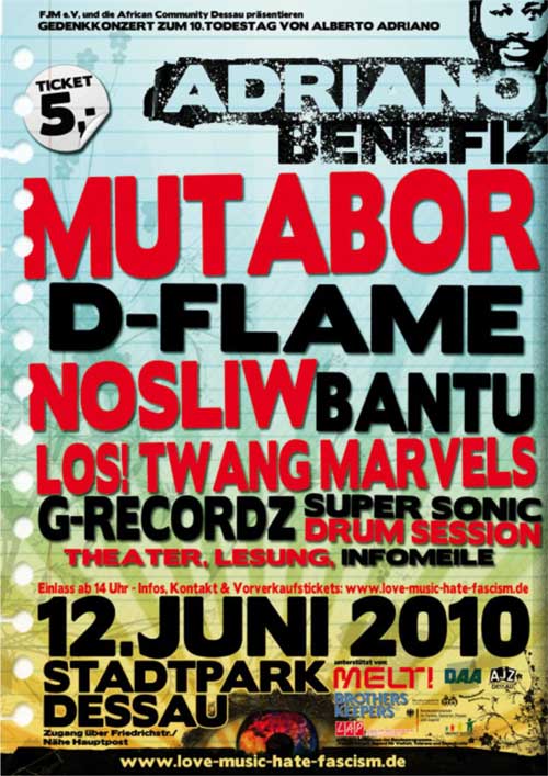 Alberto Adriano - 10 Jahre danachGedenkveranstaltung, Fachtagung und Benefizkonzert in Dessau-RoßlauAm 11. Juni 2000 erschütterte ein Verbrechen die gesamte Republik und sorgte von New York bis Moskau, von Melbourne bis London für Schlagzeilen: Neonazis schlugen und traten im Dessauer Stadtpark so brutal auf den Familienvater Alberto Adriano ein, dass er wenige Tage später seinen Verletzungen erlag (mehr dazu hier...). Die Ermordung des ehemaligen Vertragsarbeiters aus Mosambik löste erstmals eine ernsthafte und bundesweit geführte Debatte darüber aus, wie rechtsextreme Gewalt wirksam bekämpft werden kann. Im Zuge des proklamierten Aufstands der Anständigen gingen zahlreiche Aktionsprogramme für Demokratie und gegen Rechtsextremismus an den Start. Zehn Jahre danach haben sich zahlreiche Vereine und Initiativen der Stadt zusammengeschlossen, um an die schändliche Tat von damals zu erinnern. Neben dem Gedenken soll auf einer Fachtagung aber auch kontrovers darüber gesprochen werden, was sich bei der öffentlichen Auseinandersetzung und Sensibilisierung im Umgang mit Fremdenfeindlichkeit und Rassismus nun wirklich geändert hat. Ein Benefizkonzert soll dabei nicht nur das jüngere Publikum ansprechen, sondern auch der Familie Adriano zu Gute kommen. ![]() Das zweite Juniwochenende steht in der Bauhausstadt im Grünen, wie sich Dessau-Roßlau touristisch selbst vermarktet, ganz im Zeichen des 10. Todestages Alberto Adrianos. Den Anfang macht am 11. Juni 2010 eine Tagung im Dessauer Stadtpark. Dabei hat sich der Vorbereitungskreis um das Multikulturelle Zentrum der Stadt, der Landeszentrale für politische Bildung, des Netzwerkes für Demokratie und Toleranz in Sachsen-Anhalt und des Vereins Miteinander ganz bewusst dafür entschieden, mit einem großem Zelt an jenen Ort zurückzukehren, an dem Alberto Adriano so grausam misshandelt wurde. An der Podiumsdiskussion nehmen neben Stephan Kramer vom Zentralrat der Juden in Deutschland, auch Sachsen-Anhalts Integrationsbeauftragte Susi Möbeck und Mouctar Bah von der "Initiative in Gedenken an Oury Jalloh" teil. Zudem werden an mehreren Runden Tischen Antworten gesucht. Zum Beispiel auf die Fragen, was dem Land Sachsen-Anhalt zur Landtagswahl im kommenden Jahr vom rechten Rand droht oder wie sich die Fremdenfeindlichkeit zwischen Arendsee und Zeitz als Integrationshemmnis für MigrantInnen auswächst. Im Rahmenprogramm zeigt das Anhaltische Theater die Aufführung „Der Kick“. Ein Stück, dass sich angelehnt an einen antisemitisch motivierten Mord in Brandenburg, mit rechter Gewalt auseinandersetzt (mehr dazu hier...). Am Nachmittag folgt dann die Gedenkveranstaltung an der Stele im Stadtpark, die in den letzten Jahren traditionell als „Tag der Erinnerung“ begangen wurde (mehr dazu hier...). Hier hält neben Landtagspräsident Dieter Steinecke (CDU) und Innenminister Holger Hövelmann (SPD), auch der Bundesvorsitzende von Bündnis 90/Die Grünen, Cem Özdemir, ein Grußwort. Am Ende der Veranstaltung wird das Licht der Erinnerung für Alberto Adriano entzündet. ![]() Am 12. Juni wird es dann an gleicher Stelle wesentlich lauter, ohne das dabei die politische Botschaft gegen Rechts unterzugehen droht. Neben namhaften Künstlern wie D-FLAME (mehr dazu hier...) und ADE BANTU (mehr dazu hier...), die seit Jahren offensiv Rassismus in Deutschland thematisieren, sind auch die Crossoverband MUTABOR (mehr dazu hier...) und die Lokalmatodoren von G-RECORDS mit von der Partie. Das ADRIANO-Benefizkonzert, maßgeblich organisiert vom Förderverein Junger Musiker (mehr dazu hier...) und der Deutschen Angestellten-Akademie (mehr dazu hier...), setzt vor allem auf eine aktive Einbindung der afrikanischen Community der Stadt, die ebenfalls als Veranstalter in Erscheinung tritt. Außerdem beteiligten sich fast 100 SchülerInnen bereits im Vorfeld an einem Plakatwettbewerb (mehr dazu hier...). Die Bühne wird dabei nicht nur von Musikerinnen und Musikern gerockt. Neben einer Infomeile auf der Vereine und Initiativen ihre Projekte für Demokratie und Toleranz vorstellen, gibt es ein Theaterstück, eine Lesung, Kurzfilme und Live-Interviews. ![]() PROGRAMMHINWEISE IM UEBERBLICK11. Juni 2010ab 09.00 Uhr TAGUNG IM STADTPARK ausführliche Informationen hier... Kontakt Beratungsstelle für Opfer rechter Gewalt Anhalt/Bitterfeld/Wittenberg Marco Steckel Parkstr. 07 Tel.: 0340 / 66 12 39 5 Fax: 0340 / 66 12 39 5 e-mail: Diese E-Mail-Adresse ist gegen Spambots geschützt! Sie müssen JavaScript aktivieren, damit Sie sie sehen können. web: www.opferberatung-dessau.de Anmeldung Landeszentrale für politische Bildung des Landes Sachsen-Anhalt Netzwerk für Demokratie und Toleranz Geschäftsstelle Schleinufer 12 39104 Magdeburg Fax: 0391 / 56 76 4 64 e-mail: Diese E-Mail-Adresse ist gegen Spambots geschützt! Sie müssen JavaScript aktivieren, damit Sie sie sehen können. Anmeldeformular hier... 11. Juni 2010 ab 14.00 Uhr GEDENKSTUNDE IM STADTPARK alle Infos hier... Kontakt Beratungsstelle für Opfer rechter Gewalt Anhalt/Bitterfeld/Wittenberg Marco Steckel Parkstr. 07 Tel.: 0340 / 66 12 39 5 Fax: 0340 / 66 12 39 5 e-mail: Diese E-Mail-Adresse ist gegen Spambots geschützt! Sie müssen JavaScript aktivieren, damit Sie sie sehen können. web: www.opferberatung-dessau.de 12. Juni 2010 ab 14.00 Uhr BENEFIZ-KONZERT IM STADTPARK ausführliche Informationen hier... Kontakt/Tickets Förderverein Junger Musiker beatclub Dessau Tel.: 0340 / 26 60 22 6 Fax: 0340 / 26 60 21 2 e-mail: Diese E-Mail-Adresse ist gegen Spambots geschützt! Sie müssen JavaScript aktivieren, damit Sie sie sehen können. web: www.love-music-hate-fascism.de verantwortlich für den Artikel: |