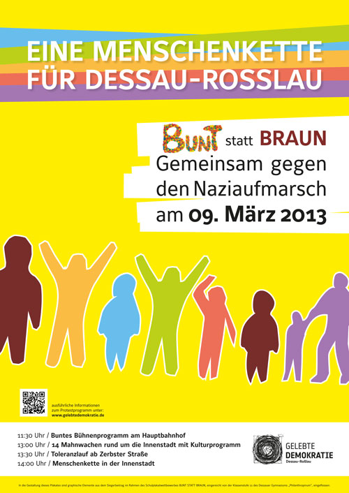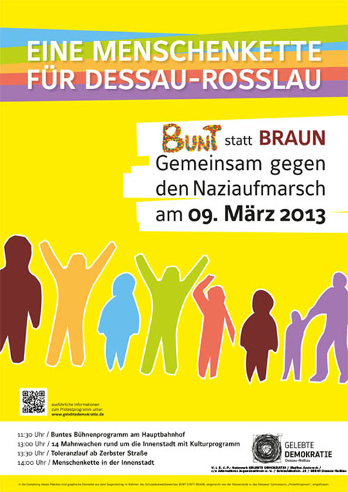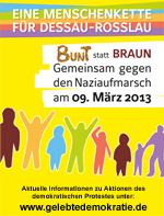 Eine Menschenkette für Dessau-RoßlauBunt statt Braun am 9. März 2013 Zusammen für eine tolerante, offene und demokratische Stadtgesellschaft: Das ist die Losung für den 09. März 2013. Das Netzwerk GELEBTE DEMOKRATIE ruft alle engagierten Bürgerinnen und Bürger zu einem bunten und phantasievollen Protest gegen einen Aufmarsch von Neonazis auf. Alljährlich im März marschieren Nazis aus dem Kameradschaftsspektrum in Dessau-Roßlau auf. Mit einem sogenannten Trauermarsch versuchen die Rechtsextremisten die historische Tatsache der Bombardierung der Stadt im Zweiten Weltkrieg umzudeuten und für ihre Propaganda zu nutzen (mehr hier...). An die Stelle des Gedenkens an die Verstorbenen setzen die Neonazis ihre eigene Version der Geschichte, in der ausschließlich von deutschen Opfern die Rede ist und die wahren Verursacher des Krieges ignoriert werden (mehr hier...). Diese Geschichtsverfälschung können und werden wir nicht unwidersprochen hinnehmen. Die Erinnerung an die Verbrechen in der Zeit des Nationalsozialismus ist Voraussetzung für eine kritische Aufarbeitung der Geschichte und damit Bedingung für eine demokratische Gesellschaft. Ein Teil der Stadtgeschichte ist untrennbar mit dem Menschheitsverbrechens des Holocausts verbunden. In Dessau wurde das tödliche Giftgas Zyklon B produziert, mit dem die Nazis Millionen von Menschen in den Vernichtungslagern ermordeten. Nicht minder wichtig ist es, allen aktuellen Erscheinungsformen des Rechtsextremismus entschlossen entgegenzutreten. Vor allem deshalb, weil die extrem rechte Szene Dessau-Roßlau im Jahr 2012 sechsmal als ihr Aufmarschgebiet missbraucht hat.