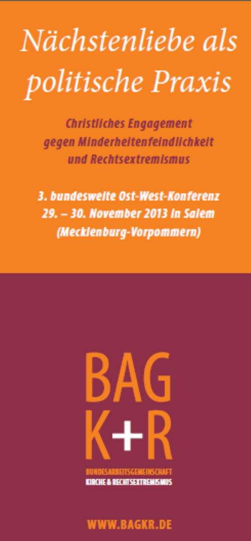 Nächstenliebe ist ein ebenso zentraler wie komplexer Begriff des christlichen Glaubens. Sie will konkret gelebt werden, in unseren Kirchengemeinden, in unseren Städten und Dörfern, in der Öffentlichkeit wie im Privaten. Die Erfahrung zeigt jedoch, dass das konsequente Handeln nach dem Prinzip der Nächstenliebe, beispielsweise beim Engagement gegen Rechtsextremismus, gegen Rassismus oder im Agieren für mehr Menschlichkeit in der Asylpolitik, auch Ablehnung in Kirche, Politik und Gesellschaft zur Folge hat. Die dritte Ost-West-Konferenz der BAG K+R wird diese Erfahrungen in der Diskussion mit Vertreter_innen aus Kirche, Politik und Zivilgesellschaft in den Mittelpunkt stellen: Wo und in welcher Ausprägung begegnet uns Rassismus und wie gehen wir mit den Auswirkungen um? Wie lebt Kirche den Begriff Nächstenliebe? Was sind Herausforderungen und wo brauchen wir innerhalb wie außerhalb kirchlicher Strukturen eine deutlichere und stärkere Position?