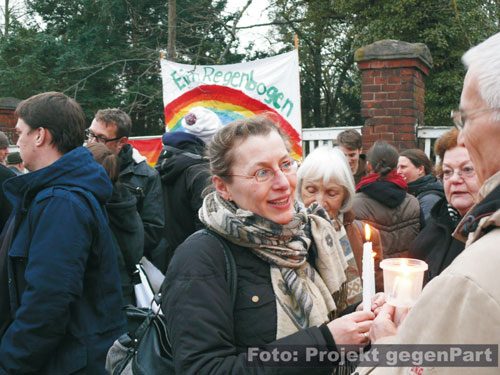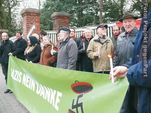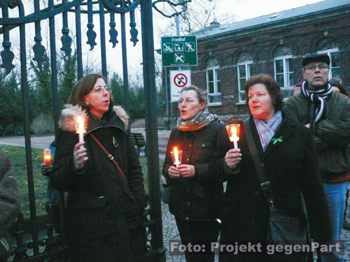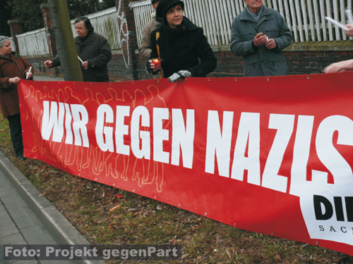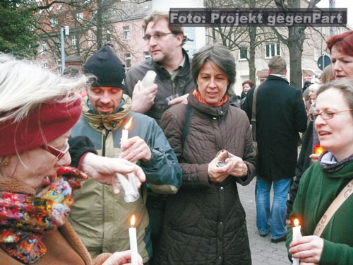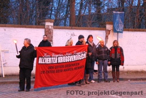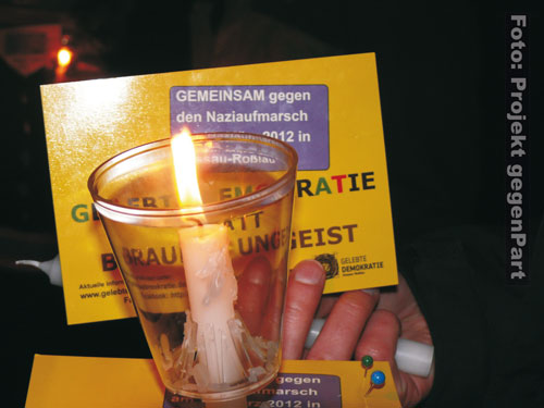„Die hat ja wirklich niemand gesehen“Neonazis aus der Region stoßen mit Kundgebung am 07. März 2012 in Dessau auf marginale Resonanz // Netzwerk GELEBTE DEMOKRATIE setzt mit Mahnwache deutliches Zeichen Die Szenerie wirkt schon irgendwie irritierend. Handgezählte 20 Rechtsextremisten haben sich in den Abendstunden des 07. Märzes 2012 am Dessauer Friedhof III versammelt und sind zu einer vom Dessauer Neonaziaktivisten Alexander Weinert angemeldeten Kundgebung gekommen. Das Datum ist mit Bedacht gewählt. Am 07.03.1945 flogen alliierte Truppen Luftangriffe auf die Stadt. Von der Öffentlichkeit fast völlig unbemerkt, stehen die Nazis mit brennenden Fackeln da und spielen in einer durch und durch grotesken Inszenierung auf der Klaviatur von Geschichtsverfälschung und glorifizieren damit die nationalsozialistischen Verbrechen. Auf ihren Transparenten transportieren die Menschenfeinde von rechts dabei die bekannten Parolen, die für die Selbstvergewisserung in der Szene nach wie vor identitätsstiftend sind. Von „Alliierten Bombenterror“, wahlweise „Alliierten Kriegsverbrechen“ oder der Aufforderung „Kein Vergeben – Kein Vergessen“ ist da die Rede. Das Netzwerk GELEBTE DEMOKRATIE protestiert gegen dieses braune Schmierentheater, keine 200 Meter entfernt – am anderen Ende der Friedhofsmauer. 80 Menschen sind zur Mahnwache LICHTER GEGEN RECHTS gekommen. Und diese Manifestation der demokratischen Bürger_innengesellschaft zeigt sich vielfältig und wohl zugleich ambivalent, zumindest was die die unterschiedlichen Lebensentwürfe, Wertvorstellungen und politischen Verortungen anbelangt. Alternative Jugendlichen stehen neben Senior_innen und einem Leitenden Oberstaatsanwalt, Kommunalpolitiker_innen unterhalten sich angeregt mit Mitgliedern von Kirchengemeinden. Nicht wenige Mahnwacheteilnehmer gehen dann auf den Friedhof um das Gräberfeld zu besuchen, in dem von den Nazis verschleppte Zwangsarbeiter_innen, aber auch Soldaten der Roten Armee, bestattet sind. Zahlreiche Zwangsarbeiter_innen kamen bei Bombenangriffen auf Dessau-Roßlau zu Tode, weil ihnen das Aufsuchen von Schutzräumen von ihren deutschen Bewachern verwehrt wurde. Sie haben in den Fabrikhallen ihr Leben verloren. Schließlich suchen die Protestler_innen die Nähe zu den Nazis, postieren sich auf der gegenüberliegenden Straßenseite. Die Polizei ist auch hier ganz entspannt, lässt die Aktion in unmittelbarer räumlicher Nähe zu. Es werden Lieder angestimmt, so u. a. der Friedenssong „We shall overcome“. Auch wenn die Text- und Tonsicherheit nicht immer gegeben ist, die jetzt nur noch 17 Rechtsextremisten bekommen es allemal mit. Apropos Nazis , die beweisen in einem unfreiwilligen Anflug von Selbstentlarvung ihre ureigenste historische Realitätsverweigerung. Auf einem Banner wird propagiert: „Der Opfer gedenken – Die Täter beim Namen nennen“. Wie recht sie doch haben. Schließlich war es das nationalsozialistische Deutschland, dass halb Europa in Brand setzte und den Kontinent mit einem Krieg überzog, der mehreren Dutzend Millionen Menschen das Leben kostete. Und während sich die Rechtsextremen um Alexander Weinert vor leerer und dunkler Kulisse, nur unterbrochen durch das Rattern der im Abstand von 10 Minuten vorbeifahrenden Straßenbahnen weiter die Beine in den Bauch stehen, sind die Nazigegner_innen schon auf dem Rückweg in die Innenstadt. Dort findet in der Pauluskirche eine Gedenkveranstaltung statt, in der die Ursachen der Bombardierung klar benannt werden. „Hier draußen hat die doch wirklich niemand gesehen“, sagt eine Teilnehmerin zum Abschluss und betont zugleich, wie wichtig ist es den demokratischen Protest auch am 10. März 2012 auf die Straßen zu tragen. verantwortlich für den Artikel: