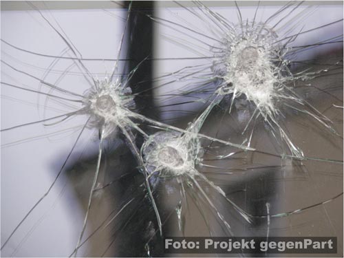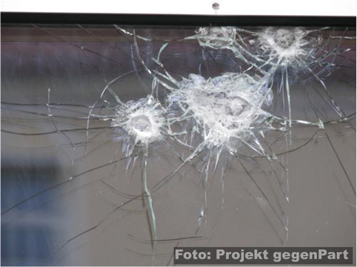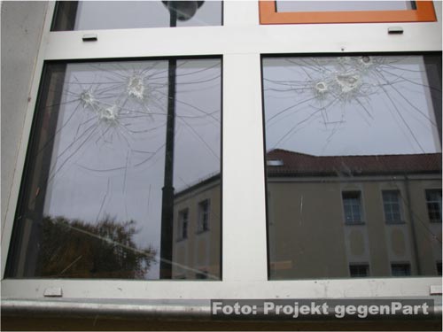 14. Oktober 2008 / Dessau-Roßlau Gegen 03.40 Uhr griff ein mutmaßlicher Neonazi das Alternative Jugendzentrum in Dessau an und zerstörte dabei, vermutlich unter Zuhilfenahme eines Schlagstockes, zwei Sicherheitsglasscheiben des Vereinscafés. Bewohner des Hauses wurden einige Minuten vor der Tat durch lautes Geschrei aus dem Schlaf gerissen. Augenzeugen berichteten, das vor dem Jugendzentrum ein dunkler PKW stand, aus dem mehrere Personen lautstark die nationalsozialistische Parole „Sieg Heil“ skandierten. Nachdem sich der Wagen mit den mutmaßlichen Rechtsextremisten zunächst entfernte, bewegte sich dann der bislang unbekannte Täter aus einer gegenüberliegenden Grünfläche kommend und zu Fuß auf das Jugendzentrum zu und schlug die Scheiben an. ![]() zerstörte Scheiben des Vereinscafés ![]() ![]() Der verständigten Polizei gelang es trotz umgehend Fahndungsmaßnahmen zunächst nicht, den Angreifer zu stellen. Bereits im Juli und August diesen Jahres griffen mutmaßliche Rechtsextremisten mehrmals das Jugendzentrum, in dem u.a. das Mobile Beratungsteam gegen Rechtsextremismus und die Koordinierungsstelle des Lokalen Aktionsplanes für Demokratie und Toleranz ansässig sind, mit Steinwürfen an. Bei diesen Attacken entstand ein Sachschaden von mehreren Tausend Euro (mehr dazu hier...) und (hier...) und (hier...). Der Verein hat Strafanzeige erstattet. Der polizeiliche Staatsschutz hat die Ermittlungen aufgenommen. |