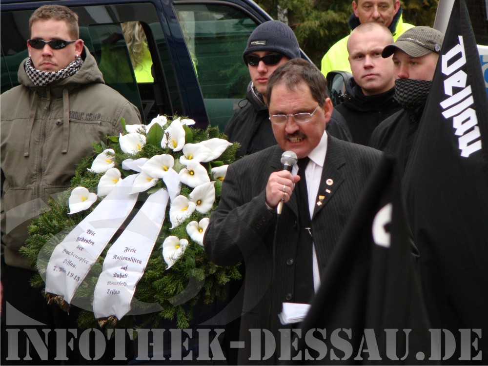 16. August 2010 / Dessau-Roßlau Der Dessauer Kreisverband des Bundes der Vertriebenen (BdV) hat an lokale Medien und Kommunalpolitiker eine Pressemitteilung anlässlich des 60. Jahrestages der Unterzeichnung der "Charta der deutschen Heimatvertriebenen" versandt. Das vom BdV-Kreisvorsitzenden Frank Nowak (mehr dazu hier...) und dem Pressereferenten des Vereins, Ulrich Brandt, unterzeichnete Papier ist durchsetzt mit völkischen und geschichtsrevisionistischen Passagen. So heißt es darin: "Heimat, Volk und Vaterland müssen wider zu Richtungskräften werden, weil sonst die Völker ihre Eigenart (...) verlieren (...)". An anderer Stelle wird der EU-Vertrag von Lissabon als "Unrecht" bezeichnet und die Benes-Dekrete als "verbrecherisch" tituliert. Wie in der extrem rechte Szene üblich, spricht der BdV-Kreisverband in seiner Erklärung vom "historischen Irrtum der alliierten Sieger- und Besatzungsmächte" und relativiert damit die Verbrechen Nazi-Deutschlands. ![]() BdV-Kreisverbandvorsitzender Frank Nowak trat als Redner auf einem Neonaziaufmarsch am 13. März 2010 in Dessau-Roßlau auf (mehr dazu hier...) Zudem rufen Nowak und Brandt zum Boykott des "Tages der Heimat" am 04. September 2010 in Magdeburg mit der Begründung auf, dabei handele es sich um "eine politisch unmoralische Veranstaltung" der etablierten Parteien. Frank Nowak verfügt über enge Kontakte zur extrem rechten Szene und beteiligt sich aktiv an Demonstrationen und Kundgebungen (mehr dazu hier...). Im letzten Jahr rief der BdV-Kreisverband zudem dazu auf, zur Bundestagswahl die neonazistische NPD zu wählen (mehr dazu hier...). Quelle: eigener Bericht