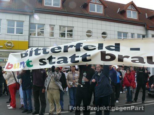 „Wir sind eine Stadt die international ist, wir reichen jedem die Hand.“Bitterfeld-Wolfen demonstriert am 03. Oktober 2009 gegen Rechts Gleich neben einer Kirmes mit allerlei Schaustellern, bunten Buden und lecker Zuckerwatte trifft sich am sonnigen Samstagmittag eine überschaubare Schar Bürger und Bürgerinnen. Doch nach einem zünftigen Rummelbesuch ist den GewerkschafterInnen, KommunalpolitikerInnen, Vereinsmitgliedern und alternativen Jugendlichen nicht zu Mute. Sie sind in das Bitterfelder Stadtzentrum gekommen, um gegen ein ganz anderes Spektakel zu demonstrieren. Am Bahnhof haben sich zeitgleich 110 Rechtsextreme versammelt, um ausgerechnet an diesem geschichtsträchtigem Datum „Für ein neues Deutschland“ durch die Straßen zu marschieren. Ein großes Polizeiaufgebot sichert den Tag in der sachsen-anhaltinischen Stadt indes ab. Ein Sprecher des Aktionsbündnisses gegen den Naziaufmarsch kritisiert zudem polizeiliche Maßnahmen im Vorfeld der Demonstration harsch und spricht von einer „skandalösen“ Vorgehensweise.Bund der Vertriebenen aus Dessau-Roßlau bekennt sich zur Wahl der neonazistischen NPDbereits in der jüngsten Vergangenheit unterstützte der ortsansässige Kreisverband die extreme Rechte in der Region