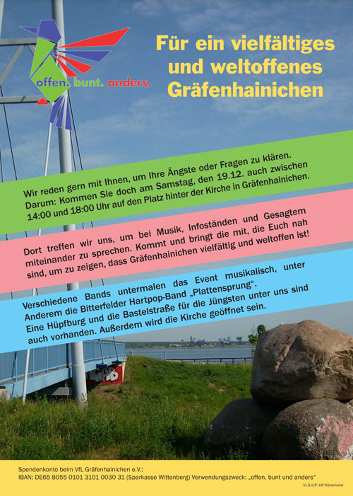 "Wir sind ein loser Zusammenschluß von Menschen aus der Verwaltungsgemeinschaft Gräfenhainichen, welche Positive Zeichen für und mit Flüchtlingen setzen wollen. Es ist eine Chance für uns alle andere Kulturen kennen zu lernen, ohne dafür weit weg fahren zu müssen. Diese Möglichkeit sollten wir nutzen, denn die Welt ist bunt und wartet auf uns. Wir nennen uns offen, bunt und anders! Aus diesen Gründen macht es uns große Sorge, das am 19.12.2015 die sogenannten Besorgten Bürger eine Demonstration in Gräfenhainichen angemeldet haben. Es muss auch klar und deutlich dazu gesagt werden, dass diese Mitmenschen eindeutig der rechtsradikalen, faschistischen und nationalistischen Ideologie unterliegen und diese verbreiten. Die Namen der Anmelder, Tilo Bach und Sebastian Kurde, sprechen dafür! Alle die derzeit dazu mobilisieren gehören zum äußersten rechten Rand der Gesellschaft. Einige Beispiele dafür sind schnell benannt: Aktionsfront Bitterfeld, Freie Nationalisten Landkreis Wittenberg, NPD Kreisverband Wittenberg, OIRAM (rechtsradikaler Liedermacher aus Wittenberg) und unzählige rechtsradikale, faschistische und nationalistische Bürger aus derVerwaltungsgemeinschaft. Wir sagen nur: Der Wolf im Schafspelz ist unterwegs. Und er versucht Schafe zu reißen... Wir erkennen, dass viele Menschen gegenwärtig unter Ängsten leiden. wir glauben jedoch, dass Ängste sich nur durch Verständnis und positives Handeln vermindern lassen und nicht durch permanente Selbstbespiegelung der eigenen Meinung und Versicherung neuer Horrorszenarien. Wir glauben, dass wir Menschen uns gegenseitig helfen müssen unsere Ängste zu vermindern. Das geht nur durch positive Auseinandersetzung mit dem was uns fremd und gefährlich erscheint. Deshalb warnen wir: wer eure Ängste schürt, hilft euch nicht und ist nicht euer Freund. Denkt selbst darüber nach ob ihr eure Ängste loswerden wollt und dann tut etwas Mutiges und Richtiges anstatt euch von rechter Propaganda einlullen zu lassen. wenn jemand euch Hass predigt, dann überlegt noch mal gut ob er nicht doch ein Wolf ist und zu was euch das macht..." AUFRUF