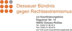 Bündnis gegen Rechtsextremismus Dessau-Roßlau ruft zum Protest gegen Neonaziaufmarsch am 20. September aufInitiative fordert von der Stadt das Verbot des rechten Aufmarsches Für ein weltoffenes und kosmopolitisches Dessau-Roßlau! Kundgebung"Dessau-Roßlau ist BUNT statt BRAUN. |