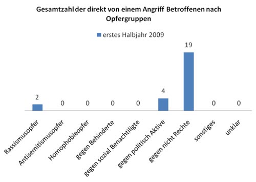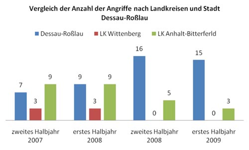 Beratungsprojekte gegen Rechtsextremismus bilanzieren erstes Halbjahr 2009rechte Gewalttaten auf unverändert hohem Niveau / Rückgang der verzeichneten Propagandadelikte / Doppelstadt Dessau-Roßlau Hochburg neonazistischer AktivitätenIn ihrer Präsentation der Halbjahresstatistik kommen die Beratungsstelle für Opfer rechter Gewalt (OBS) und das Mobile Beratungsteam gegen Rechtsextremismus (Projekt gegenPart) zu dem Schluss, dass die Region Anhalt (Dessau-Roßlau, Landkreis Wittenberg, Landkreis Anhalt-Bitterfeld) nach wie vor ein Schwerpunkt rechter Gewalt im Land ist. Die von den Projektmitarbeitern festgestellte Abnahme bei Propagandadelikten ist indes kein Beleg dafür, dass die Kampagnenfähigkeit und Deutungsmächtigkeit des organisiert und jugendkulturell verfassten Rechtsextremismus zwischen Elbe und Saale spürbar abgenommen hat: Von einer Entwarnung kann also keine Rede sein. Der Trend, dass vor allem Neonazis aus dem Kameradschaftsspektrum ihre Aktionen zusehends auf Dessau-Roßlau konzentrieren, hielt auch in den ersten beiden Quartalen im Jahr 2009 unvermindert an. So entfielen 55% der Einträge in der gegenPart-Chronik (mehr dazu hier...), in der das Projekt rechtsextreme Straf- und Gewalttaten, Propagandadelikte und Ereignislagen verzeichnet, auf die Doppelstadt. Zudem registrierte die Opferberatungsstelle insgesamt 18 rechte Angriffe, von denen allein 15 (83%) auf die kreisfreie Stadt entfielen. Angriffsstatistik der Beratungsstelle für Opfer rechter Gewalt 1. Halbjahr 2009Von Januar bis Juli 2009 sind der Dessauer Beratungsstelle für Opfer rechter Straf- und Gewalttaten in der Region Anhalt/Bitterfeld/Wittenberg 18 Angriffe mit einem rechten Hintergrund bekannt geworden. Auf den Zuständigkeitsbereich der Beratungsstelle verteilen sich die 18 Angriffe wie folgt: ![]() Quelle; Graphik: OBS Dessau Rund 83 Prozent aller Angriffe im ersten Halbjahr 2009 haben in der Doppelstadt Dessau-Roßlau stattgefunden. Der Vergleich der Anzahl der Angriffe auf den Zuständigkeitsbereich der Beratungsstelle der letzten zwei Jahre ergibt folgendes Bild: ![]() Quelle; Graphik: OBS Dessau Von den 18 Angriffen im ersten Halbjahr 2009 waren mindestens 25 Personen direkt betroffen, wobei 23 männlichen und 2 weiblichen Geschlechts waren. Den 25 Opfern jeweils einen Straftatbestand zugeordnet, ergibt folgendes Bild: ![]() Quelle; Graphik: OBS Dessau Die Einteilung der 25 Personen nach Opfergruppen und vermuteter Tatmotivation ergibt folgende grafische Darstellung: ![]() Quelle; Graphik: OBS Dessau Der Vergleich der Angriffe der Jahre 2004 bis Jahr 2008 ergibt folgendes Bild: ![]() Quelle; Graphik: OBS Dessau Bilanz des Mobilen Beratungsteams gegen RechtsextremismusDie Analyse der Beratungsfälle bekräftigt im Ergebnis den Schluss, dass in Dessau-Roßlau die mit Abstand meisten rechtsextremen Aktivitäten und Ereignislagen in der Region Anhalt zu verzeichnen sind. Von den insgesamt 25 vom Mobilen Beratungsteam begleiteten Prozessen, spielten sich 14 in der kreisfreien Stadt ab (annähernd 55 %). ![]() Dieser Umstand zeigt aber auch, dass die Sensibilität für rechtsextreme Denk- und Handlungsmuster in der Stadt stärker ausgeprägt ist als anderswo. Zugleich belegen die Zahlen, dass das Unterstützungsangebot des Mobilen Beratungsteams in der hiesigen Kommunalpolitik, der Verwaltung und der Träger- und Initiativenlandschaft angekommen ist, angenommen wird und somit eine höhere Sensibilisierung zu verzeichnen ist. ![]() Rechtsextremismus-Monitoring für die Region AnhaltDas Projekt gegenPart hat in seiner Chronik im 1. Halbjahr dieses Jahres (mehr dazu hier...) insgesamt 91 dokumentierte rechtsextreme Ereignislagen verzeichnet (2008: 150). Damit hat das Gesamtaufkommen im Vergleich zum Vorjahreszeitraum um ca. 40 % abgenommen (mehr dazu hier...). Auffällig ist hier vor allem der Rückgang bei den bekannt gewordenen Propagandastraftaten. Während im ersten und zweiten Quartal 2008 noch 119 entsprechende Delikte festzustellen waren, weist die aktuelle Chronik in diesem Bereich 42 Einträge auf. Für diese Entwicklung lassen sich bei nähere Betrachtung mehrere Erklärungsansätze finden. Der Repressions- und Ermittlungsdruck staatlicher Stellen, das jedenfalls lassen die in der Chronik erfassten Prozesse gegen Neonazis vermuten, hat offenbar spürbar zugenommen. Damit sind deutungsmächtige Akteure in der rechten Szene, vor allen in den hiesigen Kameradschaften, in ihre Handlungsfähigkeit entscheidend eingeschränkt, weil bei weiteren Straftaten mögliche Haftstrafen drohen. Außerdem ist bei einem erhöhten Repressionsszenario das nicht ganz neue Phänomen zu beobachten, dass sich die Szene verstärkt mit sich selbst beschäftigt, um die Reihen zu schließen und Abwehrstrategien zu entwickeln. ![]() vor hiesigen Gerichten finden mehr Prozesse gegen mutmaßliche Rechtextremisten und Neonazis statt Als Schwerpunkt des jugendkulturell und parteipolitisch verfassten Rechtsextremismus in der Region Anhalt, dass unterstreichen auch die Zahlen der gegenPart-Chronik, kann einmal mehr Dessau-Roßlau angesehen werden. neonazistische Kameradschaften und rechtsextreme PersonenzusammenschlüsseIm abgelaufenen Berichtszeitraum hat das Projekt gegenPart intensiv die Aktivitäten der fünf in der Region aktiven Neonazikameradschaften beobachtet (2008: 4 Kameradschaften) (mehr dazu hier...). Mit dem rechtsextremen Personenzusammenschluss „Freie Nationalisten Anhalt-Bitterfeld“ hat sich in diesem Jahr zudem eine weitere Gruppierung konstituiert, die sich personell vor allem aus jugend- und subkulturell verfassten Rechtsextremisten speist, mittlerweile in die Szene integriert ist und vor allem in der Stadt Bitterfeld-Wolfen Aktivitäten entfalten (mehr dazu hier...). Mit den Kameradschaften „Freie Nationalisten Cöthen/Anhalt“ und „Freie Nationalisten Aken/Elbe“ sind damit allein im Landkreis Anhalt-Bitterfeld drei rechtsextreme Personenzusammenschlüsse aktiv. ![]() Neonazis der Kameradschaft