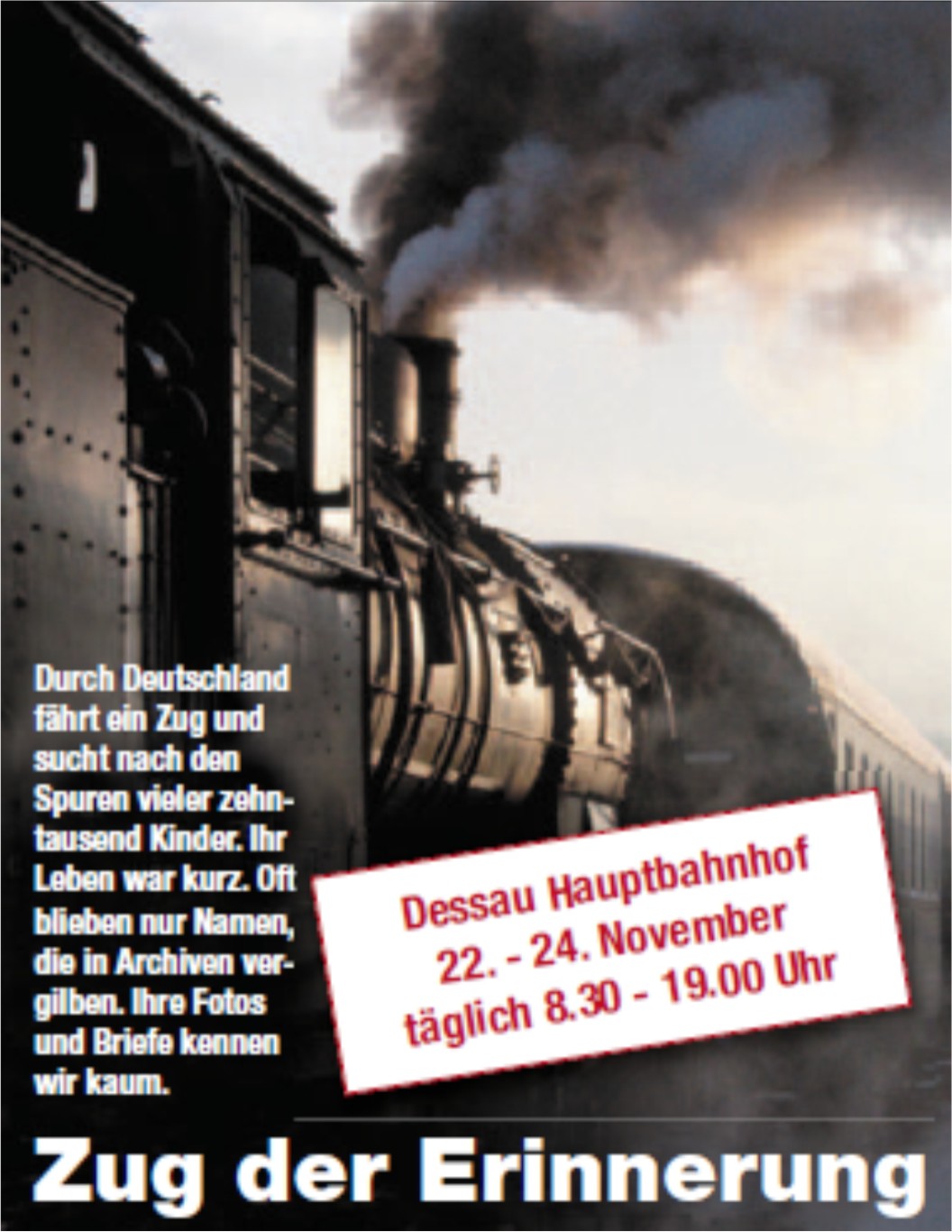Der "Zug der Erinnerung" ist seit 2007 in Europa unterwegs, um an die Deportation von mehreren hunderttausend Kindern auf dem Schienennetz der ehemaligen Reichsbahn in die deutschen Konzentrations- und Vernichtungslager zu erinnern. Die Exposition möchte damit zugleich die aktive Beteiligung von Wirtschaft, Militär und Zivilbevölkerung am Holocaust dokumentieren. Die rollenden Wander-Ausstellung macht nun in Dessau Station. In jener Stadt also, in der das Schädlingsbekämpfungsmittel Zyklon B produziert wurde, mit dem die Nationalsozialisten Millionen von Menschen ermordeten