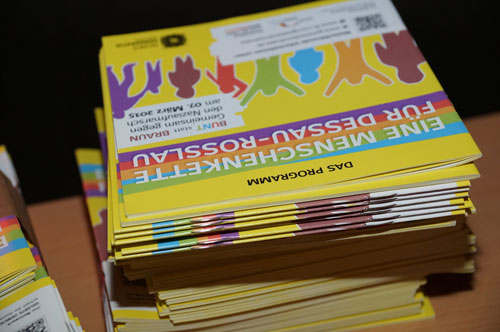 Zurück zur Marienkirche. Dort stehen nach Abschluss der Protestveranstaltung noch zahlreiche Menschen in kleinen Grüppchen beieinander und diskutieren intensiv. Das beherrschende Thema ist dabei der 07. März 2015, der bereits seine Schatten vorauswirft. An diesem Tag wollen Neonazis mit einem so genannten Trauermarsch durch die Stadt marschieren (mehr dazu hier…), um am Jahrestag der Bombardierung Dessaus mit ihrem kruden Mix aus Relativierung, Revisionismus und Geschichtsklitterung die Opfer des NS-Terrors zu verhöhnen. Die demokratische Bürgergesellschaft ist darauf vorbereitet, steht doch die 3. Auflage der Aktion EINE MENSCHENKETTE FÜR DESSAU-ROSSLAU (mehr dazu hier…) in den Startlöchern, zu der erneut 3.000 Menschen erwartet werden.