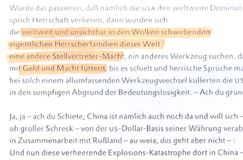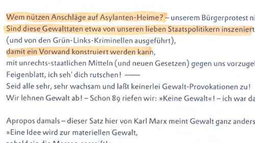 Passend zu diesem antisemitischen und verschwörungstheoretischen Weltbild wird auch herbeihalluziniert, dass die USA Schleuserbanden finanzieren die „Europa mit Asylanten-Nachschub versorgen“ oder die stark angestiegene rassistische Gewalt gegen Flüchtlinge und deren Unterstützer_innen von „Staatspolitikern inszeniert“ sei. Diese Passagen verdeutlichen nicht nur eine menschenverachtende Ideologie genährt von Antisemitismus, Rassismus und Verschwörungstheorie, sondern verharmlosen darüber hinaus rassistische Gewalt und verhöhnen die von ihr Betroffenen.