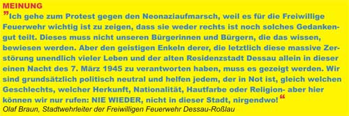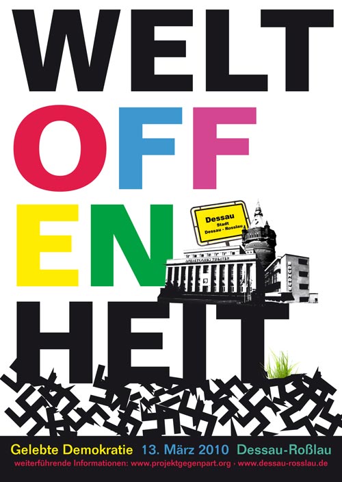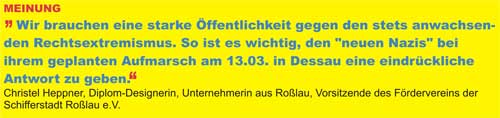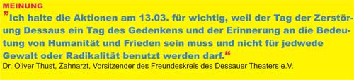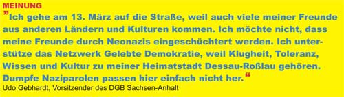 Mit DOWN BELOW, Straßentheater und Kehrmaschine gegen RechtsBreites Bündnis ruft in Dessau-Roßlau zum Protest aufEine Stadt macht mobil gegen Rechts. Das Anhaltische Theater ist ebenso dabei wie Parteien, Bildungsträger und Vereine. Das Netzwerk GELEBTE DEMOKRATIE sowieso. Sie alle eint am 13. März 2010 eine Motivation: Gesicht zeigen gegen den braunen Ungeist. Nicht zum ersten Mal marschieren Rechtsextremisten im März durch die Straßen der drittgrößten Stadt Sachsen-Anhalts. Wie bereits im vergangenen Jahr (mehr dazu hier...) und (hier...), wollen sie in ihrer geschichtsverfälschenden Logik - die die Verbrechen des Nationalsozialismus leugnet und damit die NS-Opfer verhöhnt - an die Bombardierung Dessaus erinnern. Die Organisatoren des Protestes haben sich dabei auf die Fahnen geschrieben, an die kosmopolitische Tradition des Bauhauses anzuknüpfen. Dem Zusammenschluss ist zu wünschen, dass dieser historische Rückgriff tatsächlich motivierend wirkt. Denn die Doppelstadt an Elbe und Mulde braucht keinen Aufstand der Zuständigen, sondern einen der engagierten Bürgerschaft. ![]()
