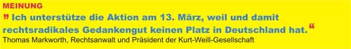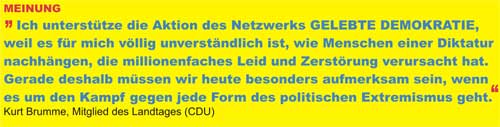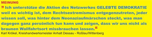 Nicht nur Dresden im Februar ist mittlerweile ein fester Termin im Reisekalender von Rechtsextremisten und Neonazis. Wenngleich die Symbolwirkung in der sächsischen Landeshauptstadt ungleich größer ist als in Magdeburg oder eben in Dessau-Roßlau, ist die Projektionsfläche vergleichbar. Zum identitätsstiftenden Kern der extrem rechten Szene gehört nach wie vor ihre große Lebens- und Daseinslüge, dass die Bombardierung deutscher Stadte im 2. Weltkrieg ein reiner Willkürakt der Alliierten gewesen sei. Dresden war ein bedeutender Verkehrsknotenpunkt, der die Infrastruktur für die Wehrmacht sicherstellte. Dessau war schon früh ein Hort des organisierten Antisemitismuses (mehr dazu hier...), ein Rüstungszentrum, und die Stadt, in dem das Schädlingsbekämpfungsmittel Zyklon B (mehr dazu hier...) hergestellt wurde. ![]() Das Netzwerk, das nun gegen den Naziaufmarsch mobil macht, betont völlig zu recht, dass ein solch brauner Geschichtrevisionismus nicht widerspruchslos hingenommen werden kann. In der Stadtgeschichte, so die positiv besetzte Kernbotschaft des Aufrufes, habe es eben auch weltläufige Impulse gegeben: "Aufbauend auf den großartigen Traditionen des Bauhauses, Kurt Weills und Hugo Junkers möchten wir Weltoffenheit und Toleranz befördern und damit Lebensfreude in unserer Stadt entwickeln und sichtbar machen." ![]() ![]() 500 Menschen beteiligten sich vor 12 Monaten am Protest in der Dessauer Innenstadt So vielfältig der Kreis der Organisatoren ist, so farbenfroh ist auch das geplante Programm. Auf dem Marktplatz in der Zerbster Straße erwartet den geneigten Mitprotestler ab 13.00 Uhr ein bunter Schüttelmix aus Meinung, Information, Musik und Kultur. Dass die Dessauer Chart-Band DOWN BELOW (mehr dazu hier...), bekannt u. a. aus Stefan Raabs Bundesvision Song Contest 2008, ihr Kommen zugesagt hat, erfreut die Veranstalter dabei besonders. Die Mannen um Sänger und Frontman Neo-Scope setzen mit ihrem 30 minütigen Auftritt im Stadtzentrum ein deutliches Zeichen für Weltoffenheit und gegen braunen Ungeist. ![]() Die ÖSA-Versicherung verteilt unter dem handlungsleitenden Slogan "Lieber Braun auf der Schnitte als Braun auf der Straße!" lecker Schnittchen und die Dessauer Wohnungsbaugesellschaft (DWG) hat Klinken geputzt und ihre Mieter mobilisiert (mehr dazu hier...). Zudem beziehen Innenminister Holger Hövelmann, Oberbürgermeister Klemens Koschig, Stadtratsvorsitzender Dr. Stefan Exner und Kirchenpräsident Joachim Liebig Position und Initiativen aus der Stadt stellen ihre Projekte für Demokratie und Toleranz vor. Eine Überraschung, so wird jedenfalls hinter vorgehaltener Hand gemunkelt, hat indes ein hiesiger Karnevalsverein in Vorbereitung. Und dass, obwohl die närrische Saison ja eigentlich schon vorbei ist. ![]() Außerdem sorgt das Theater mit der Aktion „Die Stadt als Bühne“ für künstlerische Hingucker. Beim symbolischen KEHRAUS ist zudem eine gehörige Portion Mitmachen gefragt. Und einige Institutionen und Vereine der Stadt haben sich ganz aktuell entschieden, sich innovativ am Protest zu beteiligen. Im Schwabehaus gibt es so handgemachte Mucke gegen Rechts und das Blasorchester des Kirchenkreises Dessau stellt sich an der Johanniskirche auf. Die Veranstalter hoffen, dass sich viele Bürger und Bürgerinnen anschließen und haben noch einen ganz besonderen Wunsch im Gepäck: Bringen Sie Kreativität, Stehvermögen und vor allem gute Laune mit, denn: Demokratie kann auch Spaß machen! ![]() Kundgebung // 13.00 Uhr // Marktplatz (Zerbster Str.) mit:* Live-Musik mit DOWN BELOW* Statements * Infostände ausserdem: Demokratischer KEHRAUS // 12.00 Uhr // HauptbahnhofDie Nazis aus der Stadt fegen!Bitte Besen und Putzmittel mitbringen! ![]() Bereits im letzten Jahr wurden heftig die Besen geschwungen und: Aktion die STADT als BÜHNEkreative Aktionen des Anhaltischen Theaters![]() Sorgten im März 2009 für helle Aufregung: Die Protest-Teletubbies ![]() dazu: "MUSIK STATT GEWALT" // ab 12.00 Uhr // Schwabehaus (Johannisstrasse)* Live-Jam mit lokalen Gitarren-Heroes und Liedermachernund: "Trompeten gegen Rechts" // 13.30 Uhr // Johanniskirche* Live-Musik mit dem Blasorchester des Kirchenkreises Dessau Film im Offenen Kanal: „Mehr Courage bitte! Wo Neonazis marschieren ist Protest gefragt!"Doch nicht nur prominente Zeitgenossen engagieren sich rund um den 13. März 2010. So haben Auszubildende der Stadtverwaltung den Kugelschreiber und die PC-Tastatur gegen Mikrofon und Kamera getauscht und Fragen gestellt. Infos/KontaktNetzwerk GELEBTE DEMOKRATIEAG Öffentlichkeitsarbeit Steffen Andersch tel./fax: 0340/ 26 60 21 3 e-mail: Diese E-Mail-Adresse ist gegen Spambots geschützt! Sie müssen JavaScript aktivieren, damit Sie sie sehen können. Gemeinsamer AufrufZivilgesellschaftliche Initiativen, Bürger und Bürgerinnen, Vertreter und Vertreterinnen demokratischer Vereinigungen und die Stadt Dessau-Roßlau haben sich im Februar 2010 mit dem Netzwerk GELEBTE DEMOKRATIE zusammengetan und bekunden einmütig: „Aufbauend auf den großartigen Traditionen des Bauhauses, Kurt Weills und Hugo Junkers möchten wir Weltoffenheit und Toleranz befördern und damit Lebensfreude in unserer Stadt entwickeln und sichtbar machen. Gemeinsam treten wir für Demokratie und Zivilcourage ein und engagieren uns für ein friedliches Zusammenleben aller Menschen. Für rechtsextreme Gruppen, Neonazis und Schläger ist in Dessau-Roßlau kein Platz. Bereits zum wiederholten Male wollen Rechtsextremisten am 13. März 2010 die Straßen dafür nutzen, um die Verbrechen des Nationalsozialismus zu leugnen und somit die Opfer des NS-Regimes zu verhöhnen. Wir rufen wir alle Bürgerinnen und Bürger dazu auf, sich am demokratischen Protest zu beteiligen und friedlich für eine Stadt in Vielfalt und gegen braunen Ungeist und Geschichtsrevision Gesicht zu zeigen." Netzwerk GELEBTE DEMOKRATIE Bündnis gegen Rechtsextremismus Dessau-Roßlau Lokaler Aktionsplan für Demokratie und Toleranz |