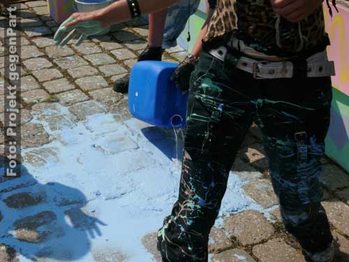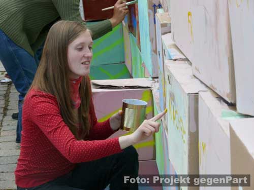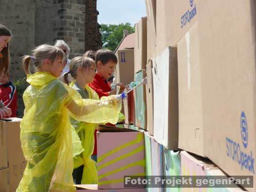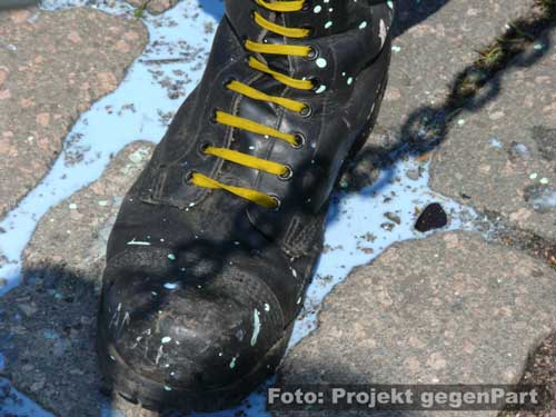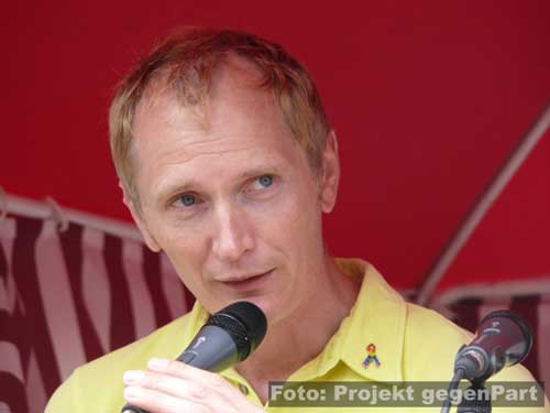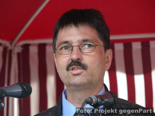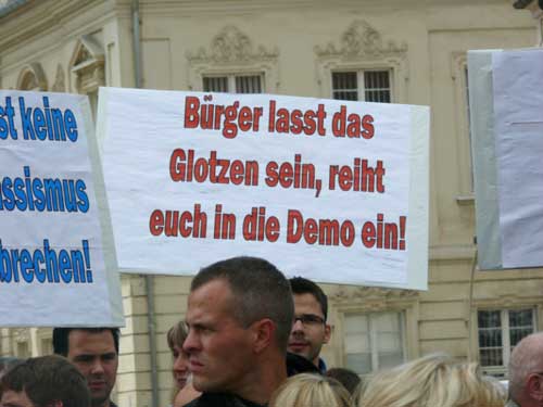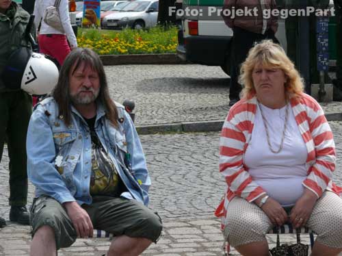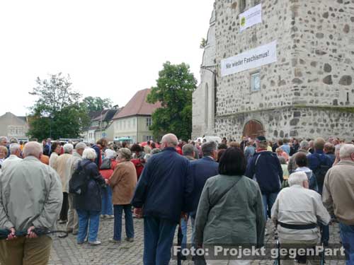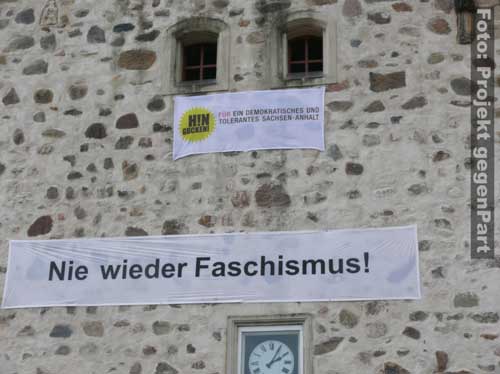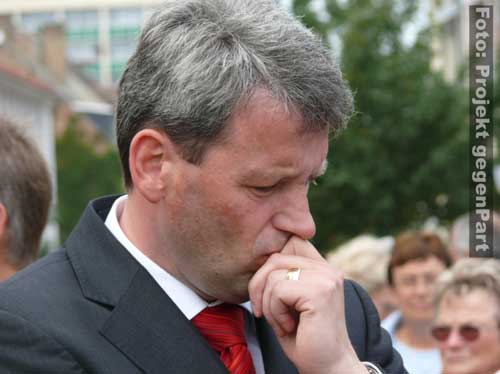 „Wer das nicht hört, dem kann nicht mehr geholfen werden.“mehrere 100 Menschen setzen in Zerbst deutliches Zeichen für Demokratie und gegen Rechtsextremismus Andreas Dittmann hat in letzten Tagen unermüdlich gerödelt und organisiert. Er hat unzählige Telefonate geführt, E-Mails verschickt und der Presse Rede und Antwort gestanden. Zu Beginn des Festes für Demokratie und Toleranz unter dem sinnigen Motto „Zerbst bekennt Farbe“ fällt beim Kulturamtsleiter der Stadt sichtlich die Anspannung ab: „Trotz Regens haben sich hier mehr Leute versammelt als unter den Fahnen der NPD.“ Und damit stapelt der SPD-Mann keineswegs zu hoch. Der Platz am Roten Garten ist mit mehreren 100 Menschen gefüllt, die politischen Verantwortungsträger sind gekommen, Vereine präsentieren sich und von der Bäckerei bis zum Baumarkt sorgt die regionale Wirtschaft dafür, dass auch genug Kuchen und Fingermalfarbe am Start ist.![]() Kulturamtsleiter und engagierter Kommunalpolitiker: Andreas Dittmann Damit, so scheint es, ist es in Zerbst erstmals gelungen, einen breitgetragenen Protest gegen Rechts auf die Straße zu bringen. Wie breit tatsächlich beweist Dittmannn wenig später, als er „die Freunde aus der K6“ begrüßt. Rund 50 Jugendliche aus dem alternativen Kulturprojekt waren wenige Minuten zuvor unter „Nazis raus!“-Rufen lautstark auf den Platz gezogen. ![]() waren durchaus willkommen: alternative Jugendliche in ihren auffälligen Klamotten ![]() Stiefeln gegen Rechts „Ich begrüße Innenminister Holger Hövelmann, die Hauptzielperson dieser miesen Attacke“, sagt Dittmann und erklärt sich damit mit seinem Parteigenossen solidarisch. Schließlich kündigt er zunächst ein konstatiertes Glockengeläut an, mit dem die Nazis symbolisch aus der Stadt geklingelt werden sollen: „Wer das nicht hört, dem kann nicht mehr geholfen werden.“ Bürgermeister Helmut Behrendt (FDP) ist vor allem über den Beschluss des Oberverwaltungsgerichtes, fast alle polizeilichen Auflagen der Neonazidemo für nichtig zu erklären und es den Rechtsextremisten zudem zu erlauben, am Haus Hövelmanns vorbeizuziehen, empört: „Wenn man selbst nicht davon betroffen ist, kann man solche Entscheidungen treffen.“ Damit, so Behrendt weiter, würde die verfassungsfeindliche NPD schließlich stark gemacht. Es könne nicht angehen, dass in einer solchen Weise die Privatssphäre eines Mannes berührt werde, der sich nicht nur einmal unmissverständlich gegen Rechtsextremismus positioniert habe. Gerade weil der Innenminister klar zu einem NPD-Verbot stehe, müsse man sich mit ihm solidarisch zeigen: „Dazu stehen wir.“ Das Stadtoberhaupt greift den Geschichtsrevisionismus der extremen Rechten auf und erteilt deren Täter-Opfer-Verdrehung eine Abfuhr: „Wer hat uns den die Amerikaner, Briten und Russen hergebracht? Das waren die Nazis!“ Einer solchen Geschichtsverfälschung müsse immer wieder widersprochen werden. Genau deshalb appelliert er abschließend: „Nicht wegschauen, hingehen und Farbe bekennen.“ ![]() Stadtoberhaupt Helmut Behrendt kritisiert mit deutlichen Worten den Gerichtsbeschluss „Die NPD mit ihren Trommeln und ihrem soldatischen Auftreten wollen uns zu einem neuen Hass verleiten.“, ist sich Kirchenpräsident Helge Klassohn sicher. Dagegen müsse man sich in aller Deutlichkeit stark machen. Klassohn benennt die Opfer des Nationalsozialismus, zu denen er diese unter der deutschen Zivilbevölkerung ausdrücklich mitzählt: „Viel zu schnell hat sich das deutsche Volk an die Macht Hitlers gewöhnt und sich geduckt.“ Die aller meisten hätten weggeschaut, als die Juden und Sinti und Roma gedemütigt, geschlagen, beraubt und schließlich in die Vernichtungslager deportiert wurden. Diese Gleichgültigkeit und Ignoranz dürfe sich nicht wiederholen und es gelte, die Menschen stark zu machen: „Demokratie braucht Demokraten. Bürger, die Demokratie auch tatsächlich wollen.“ Dazu gehöre eben auch, die politische Auseinandersetzung mit dem Rechtsextremismus zu suchen: „Zu viel steht für uns auf dem Spiel. Wir lassen uns von den Neu-Nazis nicht beschämen.“ Hier seien nicht nur Politiker und die Polizei gefragt, sondern jeder Einzelne habe eine Verantwortung für das Gemeinwesen. ![]() Kirchenpräsident Helge Klassohn appelliert an die Verantwortung aller Demokraten Das Motto „Aufstand für Deutschland“, unter dem die Nazis durch die Stadt ziehen und damit den Arbeiteraufstand vom 17. Juni 1953 für ihre menschenfeindliche Ziele instrumentalisieren wollen, bezeichnet der Kirchenpräsident „als Zumutung für den gesunden Menschenverstand“. Klassohn stellt fest: „Die Bestrebungen der NPD sind gegen und nicht für Deutschland gerichtet. Sie verbreiten Lügen und haben in Zerbst nichts suchen.“ Optimistisch verspricht er zum Schluss: „Dem braunen Ungeist werden wir widersprechen und Widerstand leisten und sei es auch in der eigenen Familie, im eigenen Freundeskreis.“ ![]() ![]() Innenminister Holger Hövelmann wirkt angesichts der turbulenten Geschehnisse um seine Person erstaunlich ruhig. Der SPD-Landesvorsitzende geht augenscheinlich in die Offensive und zeigt sich bewusst selbstsicher. „Das macht Mut und das ist gut so“, bedankt er sich unter starken Applaus dafür, dass soviele Menschen gekommen sind. Das er offensichtlich ein Heimspiel hat, ist unverkennbar. Was man heute in Zerbst erlebe, sei Wochenende für Wochenende Alltag in Sachsen-Anhalt. „Sie wollen durch die Straßen marschieren und die Straßen beherrschen.“, sagt er zu rechtsextremen Aufmärschen und Neonazidemonstrationen. Hövelmann findet das zivilgesellschaftlich-demokratische Engagement deshalb so wichtig: „Ich finde es gut das es bisher gelungen ist, danach die Straße vom braunen Dreck zu säubern.“ Er spricht von einem „regelrechten Wettbewerb“, in dem die Rechtsextremisten immer wieder versuchen würden, das Versammlungsgesetz auszureizen und gegen entsprechende Verbote und Aufl