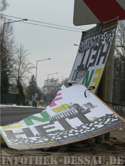 11. März 2010 / Dessau-Roßlau In den frühen Morgenstunden stellen MitarbeiterInnen der Stadtverwaltung fest, dass Dutzende Plakate des Netzwerkes GELEBTE DEMOKRATIE die zum demokratischen Protest gegen einen Neonaziaufmarsch aufrufen (mehr dazu hier...), zerstört worden sind. Engagierte Jugendliche hatten die Aufhänger erst einen Tag zuvor im Stadtbild angebracht. Außerdem beobachten couragierte Bürger wenig später, wie am hellichten Tage bislang unbekannte Täter versuchten weitere Plakate zu entfernen. Bevor die unverzüglich verständigte Polizei eintraf, konnten die Verdächtigen flüchten. Bereits im vergangenen Jahr (mehr dazu hier...) beschädigten Rechtsextremisten zahlreiche Aushänge in der Stadt. Der polizeiliche Staatsschutz ermittelt. ![]() Quelle: eigener Bericht |