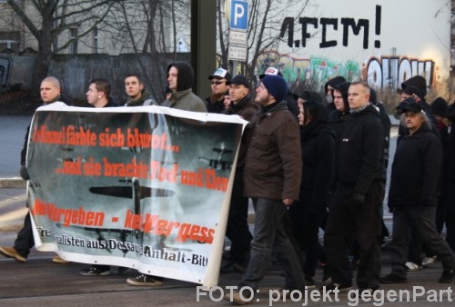 14. Januar 2012 / Magdeburg und Region Anhalt Am sogenannten Trauermarsch der Magdeburger "Initiative gegen das Vergessen" nahmen am 14. Januar auch in diesem Jahr wieder Neonazis aus der Region Anhalt teil. Zwischen 1000 und 1200 Neonazis und Rechtsextremisten zogen durch Magdeburg. Der Neonazi-Aufmarsch, der alljährlich um den Termin der Bombardierung Magdeburgs im Zweiten Weltkrieg stattfindet, bildet den Auftakt der „Trauermarsch-Saison“. ![]() Alexander Weinert (rechts) aus Dessau-Roßlau gibt den Fahnenträger. In zahlreichen Städten werden Aufmärsche organisiert, die die Neonazis zum verbreiten ihrer revisionistischen Ideologie nutzen.Mit der "Trauer" um die deutschen Opfer des Zweiten Weltkrieges soll die deutsche Kriegsschuld relativiert oder vollkommen geleugnet werden und den Alliierten Kriegsverbrechen vorgeworfen werden. Neonazis aus Dessau, Bitterfeld und der Region Anhalt nutzen den Magdeburger Aufmarsch regelmäßig, um für den eigenen Aufzug im März in Dessau-Roßlau zu werben (mehr dazu hier...). ![]() Carola Holz (Mitte) am üblichen Transparent der Neonazis aus Dessau und Anhalt. ![]() |