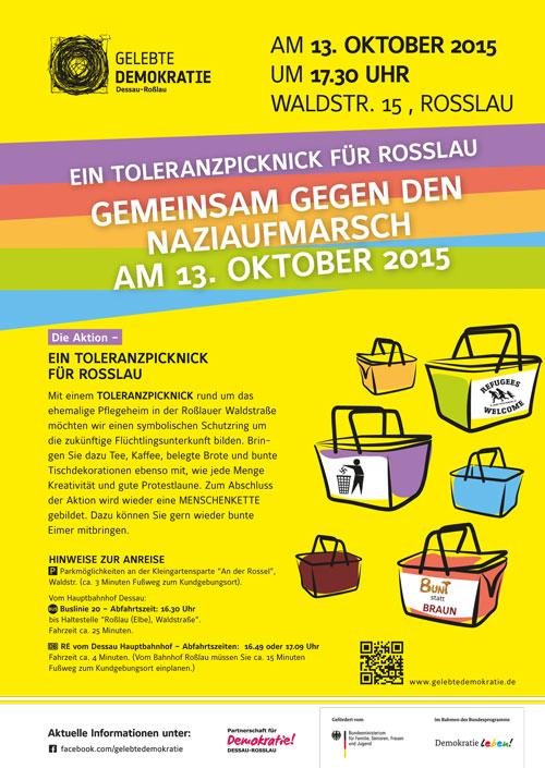 Demokratischer Protest gegen Neonaziaufmarsch am 13. Oktober 2015 in RoßlauAktion EIN TOLERANZPICKNICK FÜR ROSSLAU steht im Mittelpunkt Eine Woche nachdem 250 Neonazis zusammen mit populistischen Wutbürgern durch Roßlau zogen, planen die Rechtsextremisten am 13. Oktober 2015 erneut einen Aufmarsch. Wie schon vor 7 Tagen steht die Kundgebung unter dem Motto „Nein zum Asylantenheim in Roßlau“ und soll nach dem Vorbild der fremdenfeindlichen PEGIDA-Bewegung in einem so genannten „Lichterspaziergang“ durch Roßlau münden. Das mit dieser perfiden Inszenierung gegen Flüchtlinge gehetzt und an rassistische Vorurteile angeknüpft werden soll, haben die hasserfüllten Redebeiträge und Sprechchöre vom 06. Oktober 2015 deutlich vor Augen geführt. Das wollen und werden wir nicht hinnehmen: Gemeinsam wollen wir ein Zeichen für eine bunte, vielfältige und weltoffene Stadt setzen. Das Netzwerk GELEBTE DEMOKRATIE (mehr dazu hier...), gefördert und unterstützt von der PARTNERSCHAFT FÜR DEMOKRATIE (mehr dazu hier...), ruft daher zusammen mit zahlreichen Roßlauer Vereinen, Initiativen, Kirchengemeinden und engagierten Einzelpersonen zur Protestaktion EIN TOLERANZPICKNICK FÜR ROSSLAU auf.
