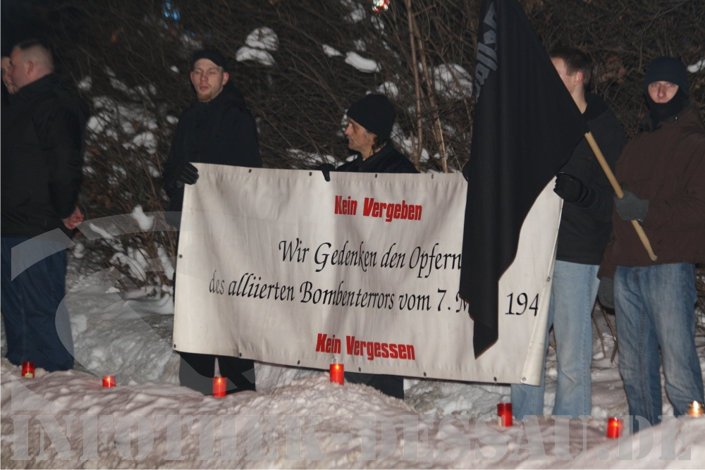 15. Januar 2010 / Köthen Etwa 35 Neonazis aus Anhalt-Bitterfeld, Dessau-Roßlau und Halle (Saale) hielten am 15. Januar 2010 eine Mahnwache in Köthen ab. Unter dem Motto: „Der Himmel färbte sich blutrot – Magdeburg, 16. Januar 1945“ wollten sie, ähnlich wie aus den Vorjahren unter dem Label: „Ein Licht für Dresden“ bekannt, den extrem rechten Opfermythos anlässlich des Trauermarsches am Folgetag in der sachsen-anhaltinischen Landeshauptstadt vorweg zelebrieren.
