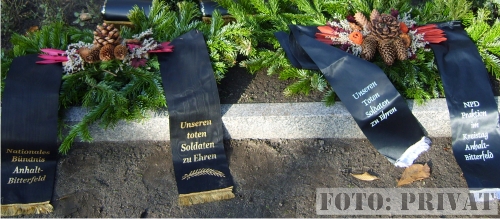 15. November 2009 / Bobbau (LK Anhalt-Bitterfeld) An den offiziellen Gedenkfeiern am Volkstrauertag nehmen in Bobbau (Landkreis Anhalt-Bitterfeld), wie auch in zahlreichen anderen Orten, Neonazis teil. Auf dem Friedhof in der Gemeinde bei Wolfen wohnten am Nachmittag sieben Neonazis der Region dem Gedenkakt bei und legten zudem zwei Kränze ab. Namentlich vertraten sie, den Aufschriften der Kränzen zufolge, die „NPD-Fraktion im Kreistag Anhalt-Bitterfeld“ und ein „Nationales Bündnis Anhalt-Bitterfeld“.
