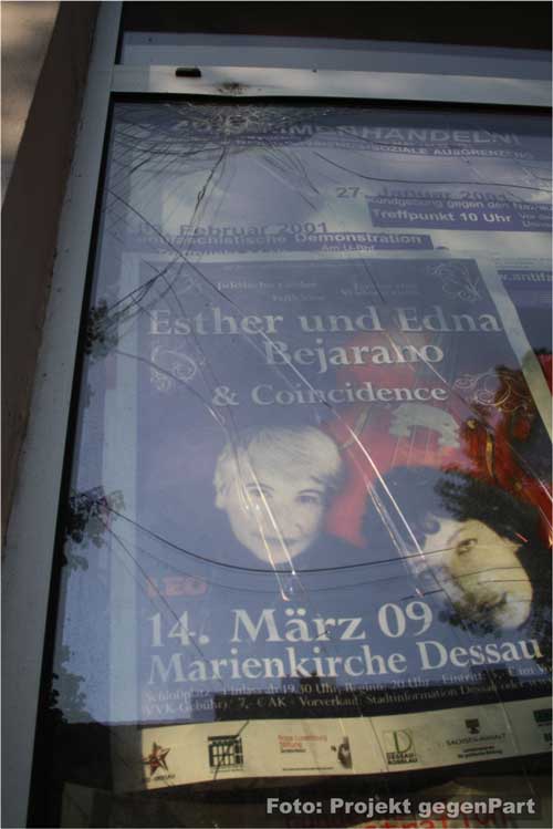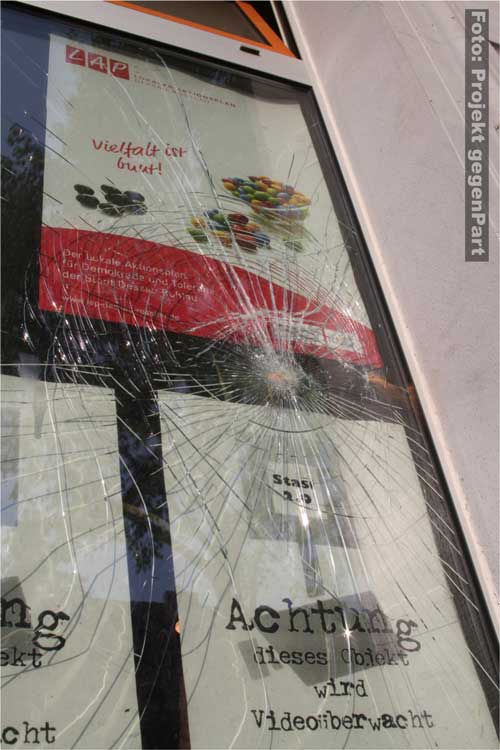 1. Mai in Dessau-Roßlau mit rechter Gewalt eingeläutetmutmaßliche Neonazis greifen Jugendzentrum mit Steinen an und verursachen erheblichen SachschadenDie Serie antisemitischer und rechtsextremer Straftaten in der Stadt reißt nicht ab. Nach dem in dieser Woche bereits die Jüdische Gemeinde mit einer Hakenkreuzschmiererei geschändet (mehr dazu hier...) und ein Mitarbeiter des Mobilen Beratungsteams bedroht wurde (mehr dazu hier...), haben nun mutmaßliche Rechtsextremisten das Alternative Jugendzentrum in der Schlachthofstraße, in dem u.a. die Koordinierungsstelle des Lokalen Aktionsplanes für Demokratie und Toleranz ansässig ist, mit Steinen beworfen. ![]() drei Schaufenster gingen bei der neuerlichen Attacke zu Bruch Dabei gingen 3 Schaufenster an dem Gebäude zu Bruch. Der vorläufige Sachschaden wird auf mindestens 1000 Euro geschätzt. Durch den Lärm aufmerksam geworden, hatten Zeugen gegen 01.30 Uhr den Angriff bemerkt und nach eigenen Angaben 5 flüchtige Täter ausgemacht. ![]() zerstörtes Schaufenster an der Fassade des Jugendzentrums Der verständigten Polizei gelang es später, die für die Tat verwendeten Wurfgeschosse sicherzustellen. Der Verein hat Strafanzeige erstattet. Der polizeiliche Staatsschutz ermittelt wegen Sachbeschädigung. Nach dem das Jugendzentrum im vergangenen Jahr mehrmals von Rechtsextremisten angegriffen worden war (mehr dazu hier...) und (hier...) und (hier...), ordnete die Polizei gegen den Widerstand des Trägers eine Videoüberwachung des Objektes an (mehr dazu hier...). Trotz dieser Maßnahme , war das Vereinsdomizil mit der neuerlichen Attacke in diesem Jahr bereits zweimal das Ziel rechter Attacken (mehr dazu hier...). |