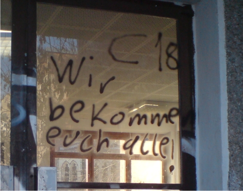 Rechtsextreme Sprühereien sind von unbekannten Tätern mutmaßlich in der Nacht zum 16. Dezember 2009 an einem städtischen Gebäude am Schloßplatz angebracht worden. Die Sprühereien, mit denen unter anderem zum "Nationalen Widerstand!" aufgerufen wird, beinhalteten ferner auch Bedrohungen gegen konkrete Personen, die der extrem rechten Szene in der Region häufiger ein Dorn im Auge sind. So wird unter dem Kürzel "C18", welches im Szenegebrauch für eine rechtsterroristische Vereinigung steht, auch die Ankündigung formuliert: "Wir bekommen euch alle!" Die Farbsprühereien weisen dann abschließend die Vornamen zweier Personen aus, die hierdurch bedroht werden sollen.