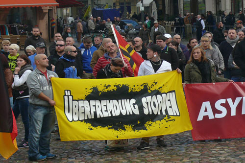 Unter dem Motto "Unsere Stadt - Unsere Heimat - Asylflut stoppen" fand auf dem Wittenberger Marktplatz eine Kundgebung mit anschließendem "Spaziergang" statt. Organisiert wurde die rassistische Mobilisierung vom Kreisverband Wittenberg der NPD (mehr dazu hier...) und den "Freien Nationalisten Wittenberg". Dementsprechend hielten u.a. Thomas Grey (mehr dazu hier...), Peter Walde (mehr dazu hier...) und Jennifer R. (mehr dazu hier...) ihre menschenverachtenden und antidemokratischen Redebeiträge.