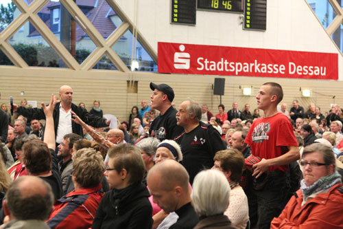 Bei einer Informationsveranstaltung zur Flüchtlingsunterbringung in Roßlau kam es zu Störungen durch bekannte Akteure der extrem rechten Szene.