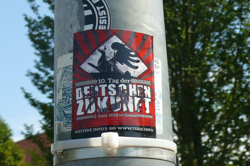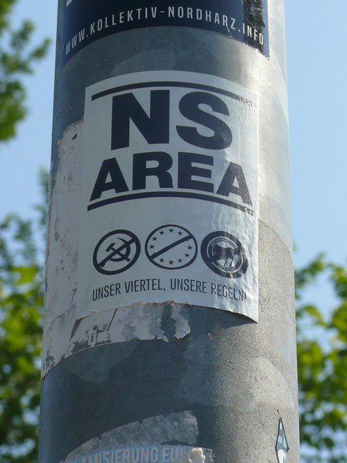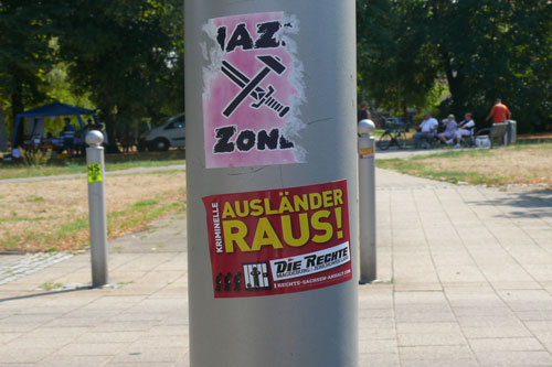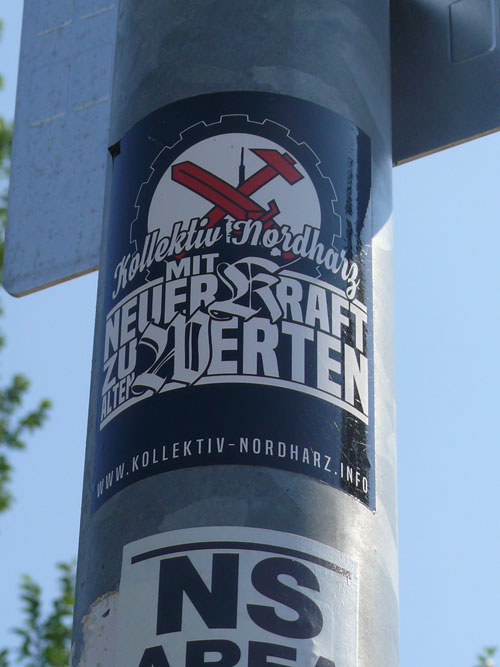 In der Nacht vor dem Event „Roßlau rockt für Vielfalt und Toleranz“ (mehr dazu hier...) der Initiative Buntes Roßlau verklebten bislang unbekannte Täter über 200 Sticks mit rechtsextremistischen und neonazistischen Inhalten. Auf den Aufklebermotiven die rund um den Roßlauer Schillerplatz festgestellt wurden, waren u. a. die Parolen „Für den nationalen Sozialismus! NS-Area“, „Kriminelle Ausländer raus! und „Mit neuer Kraft zu alten Werten“ zu lesen. Als Herausgeber der Sticks fungierten indes ganz unterschiedliche neonazistische Gruppierungen wie die militante Kameradschaft „Kollektiv Nordharz“ oder die rechtsextreme Kleinstpartei „Die Rechte“. Zum Konzert „Roßlau rockt für Vielfalt und Toleranz“ das einen Tag später stattfand, provozierten indes lokale Neonazis die Gäste durch ihre Anwesenheit (mehr dazu hier…).