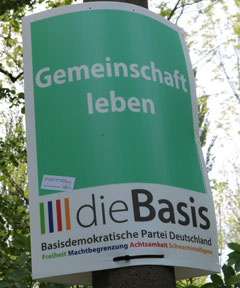 Im Plakatwahlkampf der Partei „die Basis“ zur Landtagswahl 2021 im Landkreis Anhalt-Bitterfeld wird die relative Inhaltslosigkeit der Partei, die eine Nähe zur Querdenken-Bewegung aufweist, deutlich. Auf den Wahlplakaten fanden sich außer einer diffusen Bezugnahme auf „Gemeinschaft“, „Zusammenhalt“ und „Familie“ sowie den vier „Säulen“ der Partei – Freiheit, Machtbegrenzung, Achtsamkeit & Schwarmintelligenz – keinerlei inhaltliche Forderungen. Laut Tagesspiegel stellt die Partei ein Sammelbecken für Coronaleugner:innen und Verschwörungsideolog:innen dar, ebenfalls sollen Verbindungen zum rechten Compact-Magazin bestehen. Eines der prominentesten Mitglieder der Partei, der Rechtsanwalt Rainer Fuellmich, soll mit Bezug auf die Corona-Politik behauptet haben die Bundesregierung plane schlimmeres als den Holocaust und wolle „eine Art KZ“ für nicht Geimpfte errichten, was eine klare Verharmlosung der Verbrechen NS-Deutschlands darstellt.