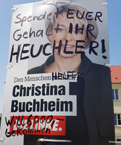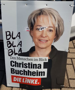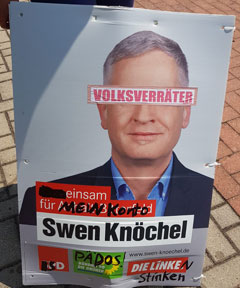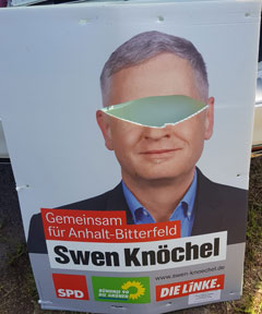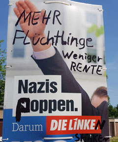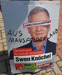 Am 01. Juni werden in Köthen und Umgebung mehrere beschädigte Wahlplakate der Partei "Die Linke" für die Landtagswahl in Sachsen Anhalt gefunden. Die angebrachten Schmierereien und Beklebungen greifen mit Begriffen wie "Heimatverräter" und "Volksverräter" übliche Parolen der politischen Rechten auf. Aussagen wie "Mehr Flüchtlinge, weniger Rente" versuchen in sozialpopulistischer Manier Stimmung gegen Geflüchtete und Migrant:innen zu machen.